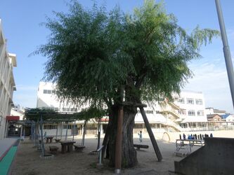 皆実小学校には、爆心地から2,160mで被爆したシダレヤナギがあります。