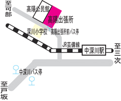 - JR: Three minute walk from Naka-Fukawa Station (中深川駅)