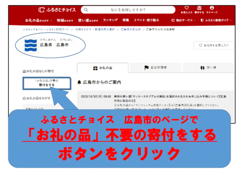 - ふるさとチョイス、広島県広島市のページ左上の「返礼品なしの寄付をする」ボタンを押してください。