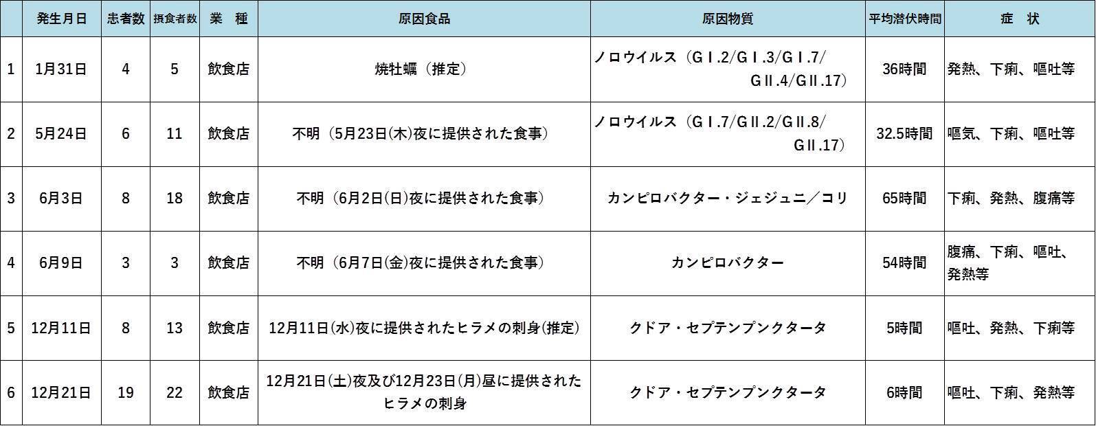 事件数6件のうち、魚介類(カキ、ヒラメ)を原因としたものが3件、食事のみ特定したものが3件であった(表2)。