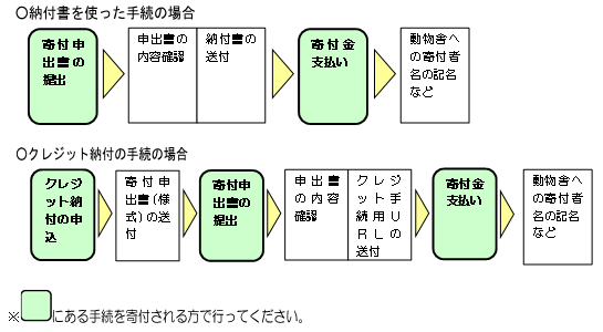「広島市安佐動物公園再整備等寄付申出書」の内容を確認後、納付書をお送りしますので、金融機関でお支払いください。