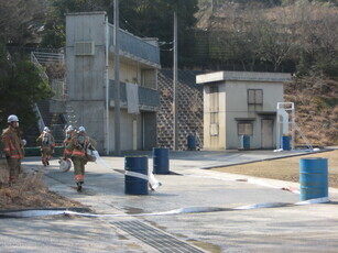 実戦消防操法訓練とは火災現場に到着してからの消火・救助の活動が素早く行えるようにするための訓練です。