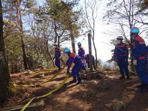 署と団が連携して、山頂まで消防用ホースを約85本延長し、ポンプ運用技術や各級指揮者の指揮能力の向上を目的とし、空気が乾燥して、山火事が多く発生するこれからの季節に備えました。