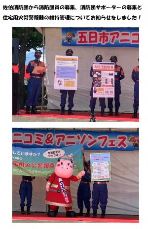 令和4年5月22日(日曜日)に日本のアニメイベントが広島市佐伯区五日市中央公園で開催されました。広島市佐伯消防団五日市北分団と女性隊のメンバーが会場ステージで消防団員の募集、消防団サポーターの募集と住宅用火災警報器の維持管理についてPrしました。