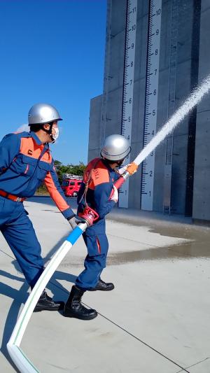 この訓練では、消防団員として基本的なホース延長や動力ポンプの操作などの知識、技術を習得することができ、大変有意義な訓練でした。