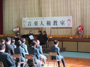 令和4年11月7日、広島市立日浦中学校において音楽人権教室を行い、広島交響楽団による弦楽四重奏を鑑賞しました。クラシック音楽や普段テレビで耳にする曲などが演奏され、楽団員の方から曲の説明を受けながら、音楽を通して人に対する思いやりや命の大切さなどを考える貴重な機会となりました。
