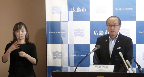 市からの発表案件を伝える松井市長(右)と手話通訳者(左)