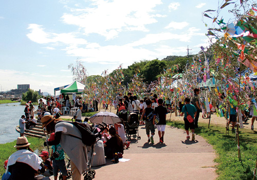 願い事を書いた笹飾りやバザーなどで、瀬野川河川敷や畝公園がにぎやかに