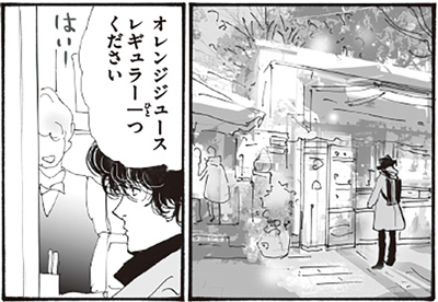 遺産相続人候補の少女・狩集汐路と出会う直前のシーンで描かれたカフェ。広島観光を満喫中の整が、Caffè Ponte(カフェポンテ)でオレンジジュースを注文する1コマ(2巻掲載)