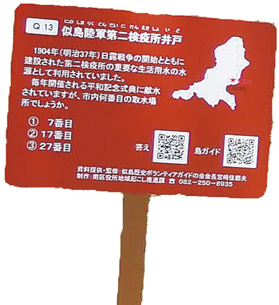 似島には数多くの戦争遺構が点在しています。このたび、遺構付近25カ所に説明看板を設置しました。島の散策の際にぜひ探してみてください。看板ごとに出題されるクイズは、二次元コードを読み取って答え合わせをしてください。