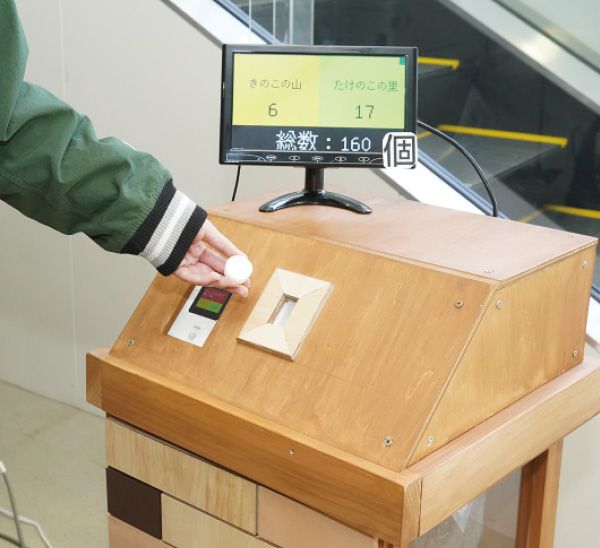 「HIT SDGs Action Members」は、広島工業大学の「SDGs推進センター」の教職員と一緒にSDGs活動を盛り上げるために発足した学生団体。ペットボトルふた回収のための箱(下写真)を制作したり、フリーマーケットを行ったりしています。回収したふたは、NPOに寄付し、発展途上国へのワクチン提供支援につなげています。同団体の中本稔願(なかもと ねがい)さんは「ふたを入れると自動で数をカウントできるのが一番のポイント。さらに、学生がふたを入れることが楽しくなるよう、投入時に『あなたは犬派? 猫派?』などの投票機能を付けました。より多くの人に分別や支援の意識をもってもらえるよう改良を重ねたい」と意気込みます。