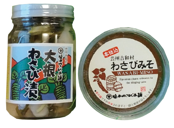 自社栽培のわさびと厳選した大根を、自然素材の利尻昆布だしと醸造酢で甘酢仕立てに。大根の食感とわさびの風味と辛みが絶妙なわさび漬けとわさびみそのセットです。商品の問い合わせは、同社(電話0829-77-2157、ファクス0829-77-2625)