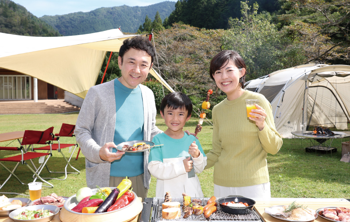 年に数回湯来を訪れるという大和(やまと)さんご家族。「湯来は、自然にあふれ、温泉もあるのでお気に入りでよく遊びに来ます。訪れやすい距離というのもいいですね。ここではバーベキューコンロなどのレンタルや、テントの設置の仕方も教えてもらえるので、キャンプ初心者の私たちでも安心。雪中キャンプも憧れますよね」とほほ笑みます。