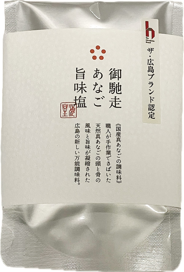国産真あなごの頭と骨を使った調味塩。あなご本来の風味が凝縮されただし塩で、さまざまな料理をワンランク上の味わいに仕上げてくれます。商品の問い合わせは、同社(電話501-6011、ファクス501-6012)